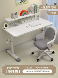 【エレガントホワイトテーブルとチェアセット】120*60ハンドリフトシングルテーブル+本棚+昇降可能な4本脚スタディチェア
