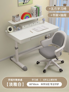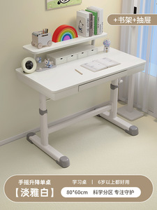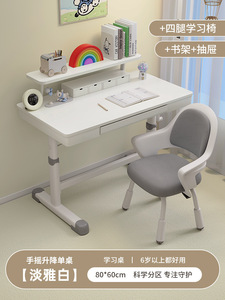 【エレガントホワイトテーブルとチェアセット】80*60ハンドリフトシングルテーブル+本棚+引き出し+昇降可能な4本脚学習椅子