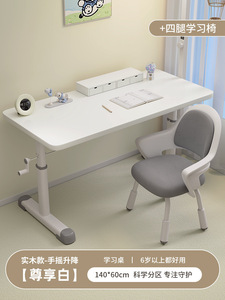 【限定ホワイト無垢材モデル・テーブル&チェアセット】140*60手動昇降シングルテーブル+昇降式4本脚学習椅子
