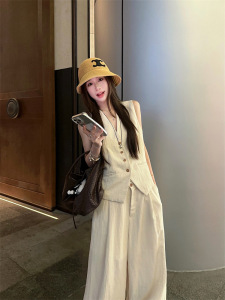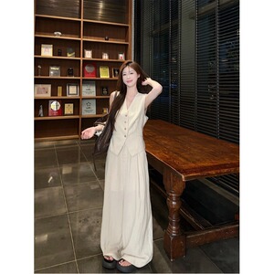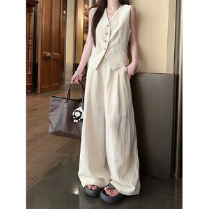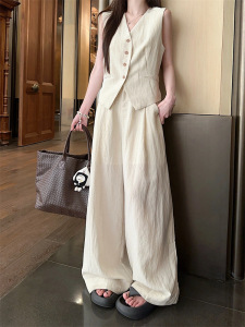 ファッションスーツシングルブレストベストベストトップ女性の夏のハイウエストカジュアルパンツワイドレッグパンツ感覚ツーピーススーツ