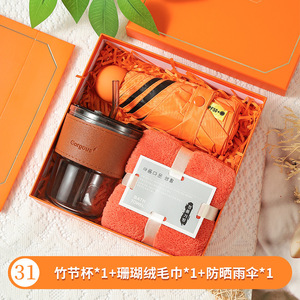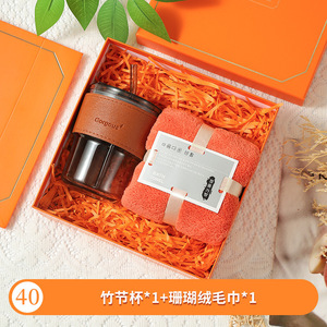 【オレンジギフトボックス+ギフトバッグ】竹カップ+コーラルベルベットタオル+日焼け止め傘