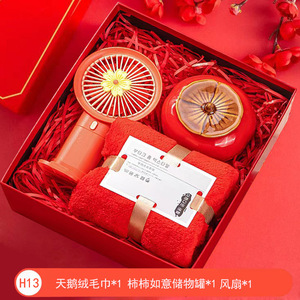 【オレンジギフトボックス+ギフトバッグ】魔法瓶カップ+コーラルベルベットタオル+小型扇風機