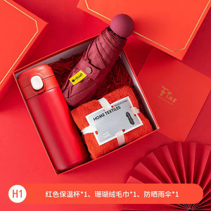 【赤いギフトボックス+ギフトバッグ】魔法瓶カップ+傘+タオル