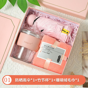 【ピンクギフトボックス+ギフトバッグ】竹カップ+コーラルベルベットタオル+日焼け止め傘
