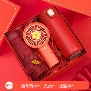 【赤いギフトボックス+ギフトバッグ】魔法瓶カップ+傘+小型扇風機