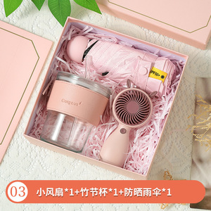 【ピンクギフトボックス+ギフトバッグ】魔法瓶カップ+日焼け止め傘+小型扇風機