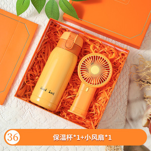 【オレンジギフトボックス+ギフトバッグ】魔法瓶カップ+小型扇風機