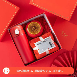 【赤いギフトボックス+ギフトバッグ】魔法瓶カップ+柿瓶+タオル