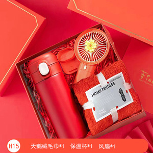 【赤いギフトボックス+ギフトバッグ】魔法瓶カップ+扇風機+タオル