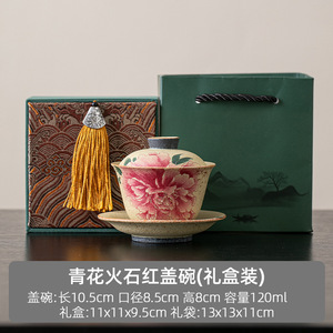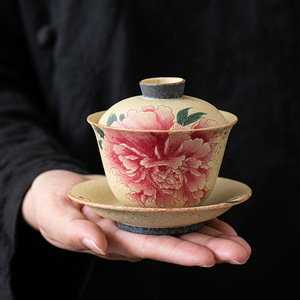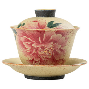 オールドレトロ風 フリントレッドピオニー - 三彩蓋鉢+カップ2個(タッセルボックス)