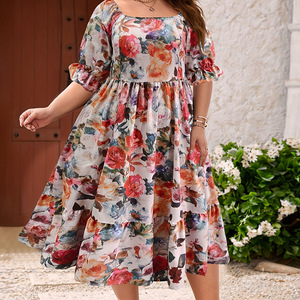 跨境女装成人大码春夏款度假风印花后背收腰袖口木耳边设计连衣裙