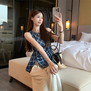 アメリカンレトロチェック柄ノースリーブベストレディース夏スリムフィットニッチ韓国デザインピンチウエストスリットトップ