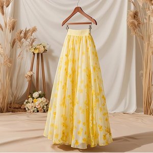 今年人気の新作小柄ドレープ超美品Aラインスカート黄色花柄スカートレディース春