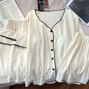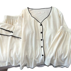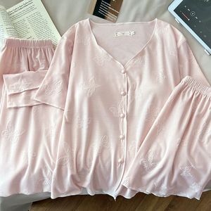 夏の新作女性用パジャマ モーダルVネックカーディガン 蝶エンボス加工 胸パッド付き 3点セット 外でも着られるホームウェア