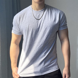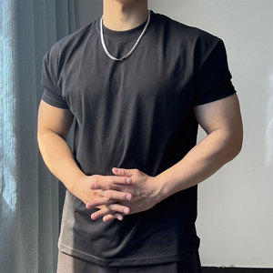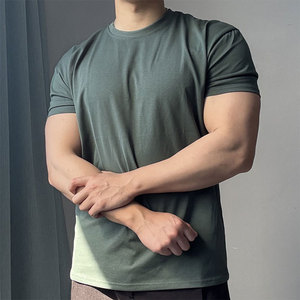 肩幅が広く、袖口が絞られた半袖メンズ夏フィットネススポーツ小さなネックライン半袖右肩ラウンドネックスリムフィットTシャツ