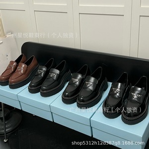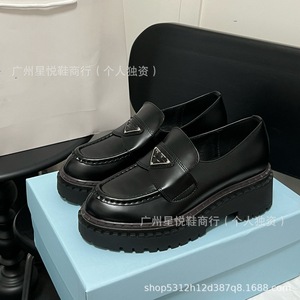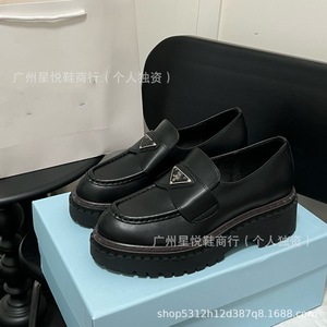 高定2025新款三角标经典乐福鞋英伦风圆头浅口粗跟一脚蹬小皮鞋女