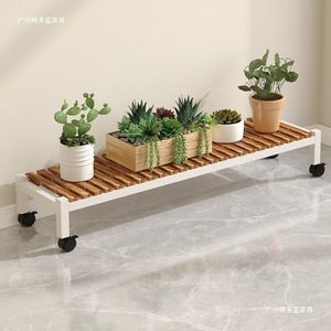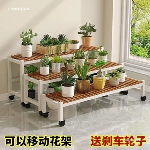 無垢材単層多肉植物フラワースタンドバルコニー屋内外モバイル植木鉢スタンド多層屋外はしご鉢植えスタンド滑車付き
