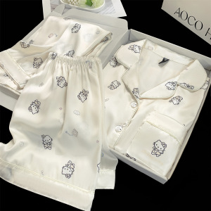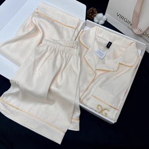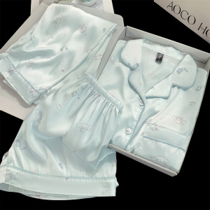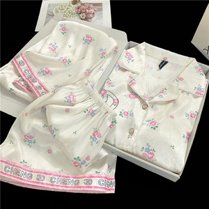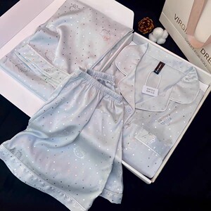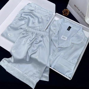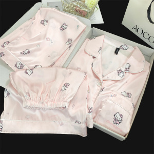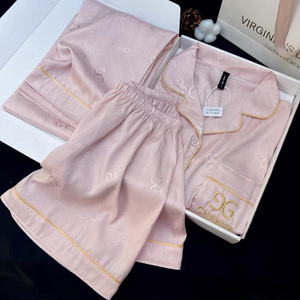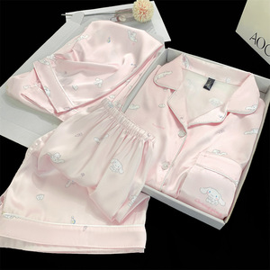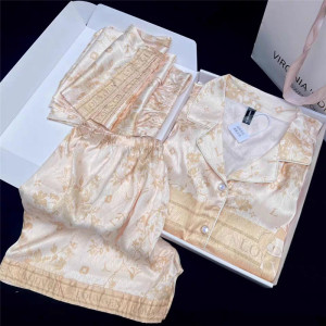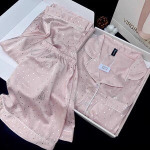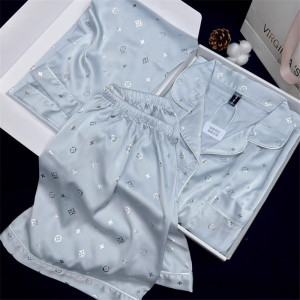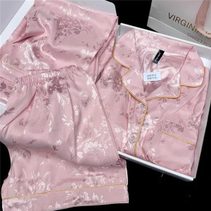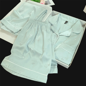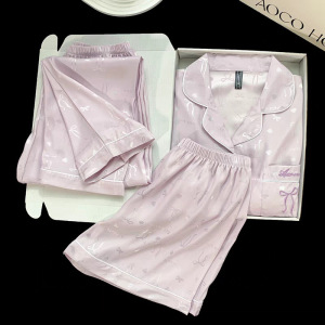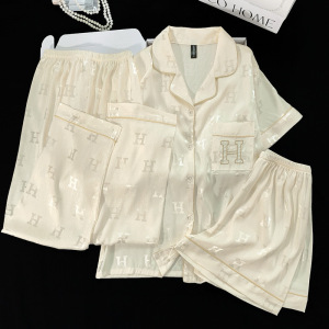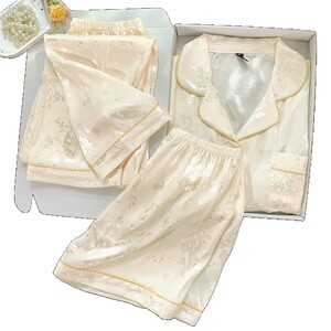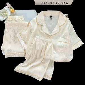 胸パッド付きアイスシルクパジャマ3点セット、レディース国民風花柄夏薄手半袖ジャカードアイスシルクホーム服