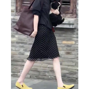 軽くて大人なフレンチレトロなハイウエストの黒のスリムな水玉模様のミドル丈スカート、ファッショナブルなストレートスカート、女性に多用途