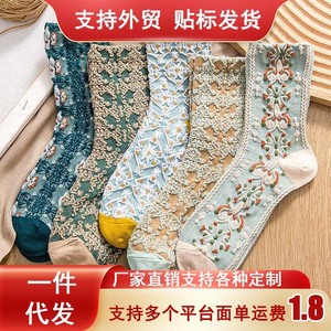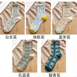 レトロ立体レリーフソックスレディース秋冬ミッドカーフソックス韓国風文学的でかわいい森風花柄レディースストッキング