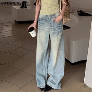 アメリカンハイストリートストレートジーンズ女性用2025新スタイルライトブルーデザインスリムハイウエストルーズワイドレッグパンツ