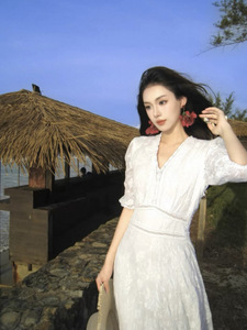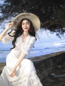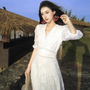在庫更新 深圳南油婦人服 リゾート風 新作 フレンチレース刺繍 Vネック ミディアム丈ワンピース
