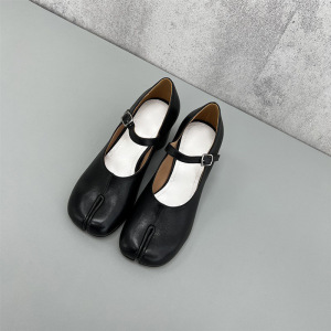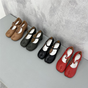 小众羊皮玛丽珍分趾鞋女tabi猪蹄搭扣真皮粗跟高跟浅口单鞋小皮鞋