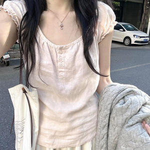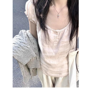 温柔甜美浅粉色纽扣U领短袖T恤女夏季修身显瘦泡泡袖上衣