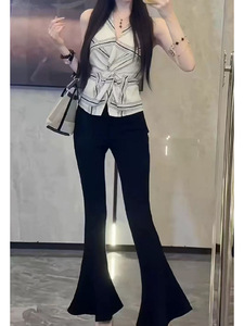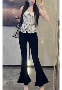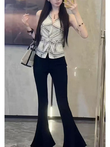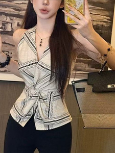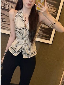 「リラックス」オールドマネースタイルリネンVネックツイストノースリーブウエストベスト+ハイウエストカジュアルパンツ