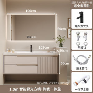 高精細スマート収納コンパートメント + オーク材ドアパネル + 宅配 - 100cm セラミック一体型洗面器 + 無料交換引き出し式蛇口