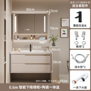 高精細スマート収納コンパートメント + オーク材ドアパネル + 宅配 - 60cm セラミック一体型洗面器 + 無料交換引き出し式蛇口