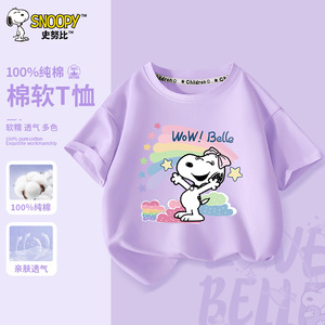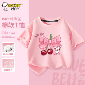 スヌーピーガールズピュアコットン半袖Tシャツ2025夏新作ビッグ子供用ファッショナブルな夏服子供用ルーズ半袖トレンド