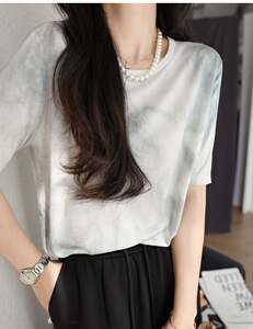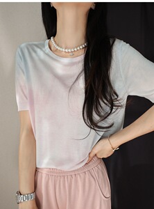 レインボーグラデーションタイダイ100リヨセルクールドレープルーズラウンドネックニットTシャツ半袖トップ女性用夏新