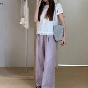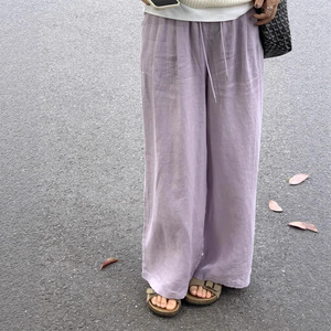 女性用ホワイトラミーパンツ、ウォッシュドリネンワイドレッグパンツ、春夏カジュアルでリラックスしたオールドマネースタイルストレートコットンとリネンのフロアレングスパンツ