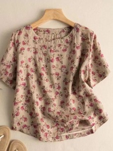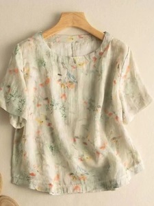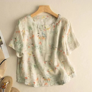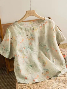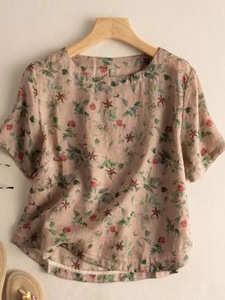 外国貿易輸出ラストオーダーの小さな新鮮な花柄のコットンとリネンのプルオーバートップ、女性用多用途スリミングコットンとリネンの半袖Tシャツをピックアップします。