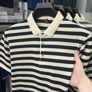 2025新型ストライプ衝突色カジュアルメンズ半袖POLO襟夏tシャツトレンドリード半袖tシャツ上着
