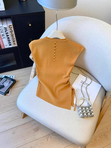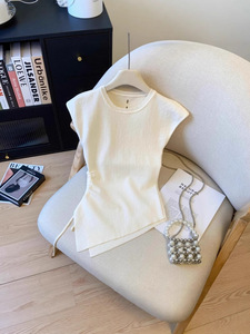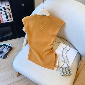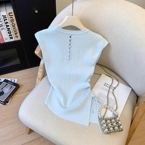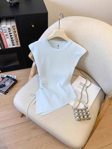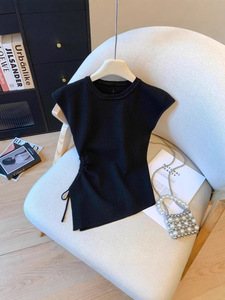 ブランド貿易~カットラベルカウンター不規則巾着ノースリーブTシャツレディース背中中空デザインスリムトップ夏