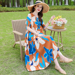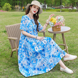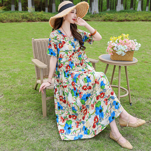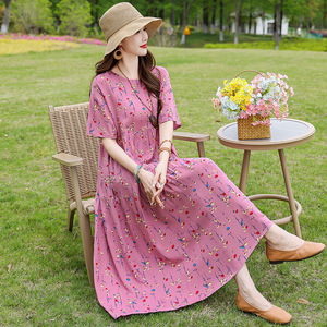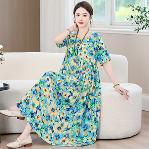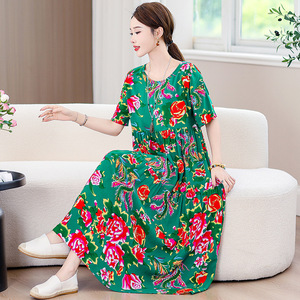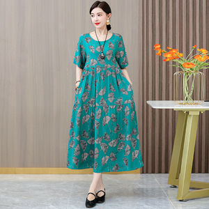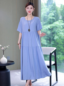 夏の綿シルクドレス女性のプラスサイズルーズロング膝上スカート 2025 新しいスタイルスリムママドレス