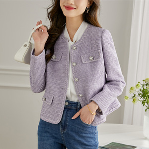 女性用の紫色の気質のシンプルな小さな香りのジャケット、春と秋のファッション、クラシックな社交界の女性、多用途のスリムなショートジャケット