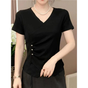 半袖2025夏の新型痩せファッションはvネックのゆったりとした純色の洋気百tシャツの不規則な韓国版です。