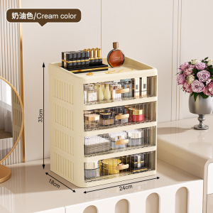 クリーム+透明ホワイトフラットトップ折りたたみ化粧品収納ボックス4層、2ドア、2引き出し
