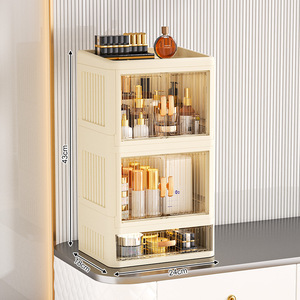 クリーム+透明ホワイトフラットトップ折りたたみ化粧品収納ボックス3層、2ドア、1引き出し