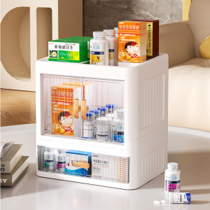 ソリッドホワイト+透明ホワイトフラットトップ折りたたみ化粧品収納ボックス、4層、2ドア、2引き出し
