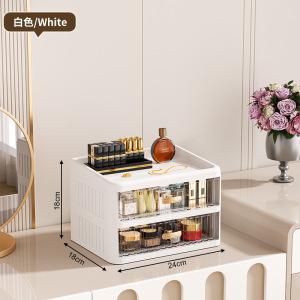 ソリッドホワイト+透明ホワイトフラットトップ折りたたみ化粧品収納ボックス、2層、1ドア、1引き出し付き