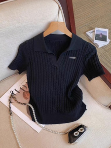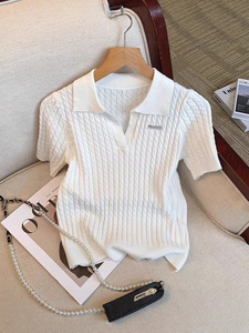 レトロ麻花半袖tシャツvネック上着女性夏2025新作修身poloシャツショートタイプ氷糸ニット