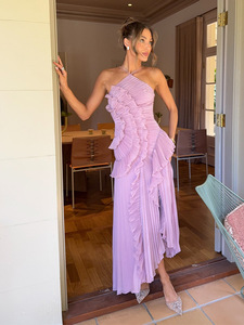 2025欧米の夏の女装の新型の気質の名媛のハスの葉の辺のしわは首のガーターのワンピースのロングスカートの女性を掛けます。