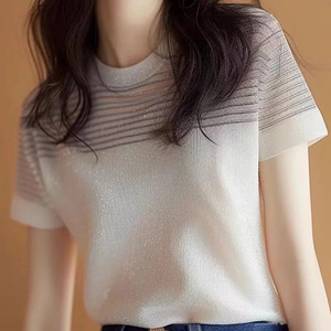 ストライプのデザインの夏の新型のフランス式の半袖の香りの風は純色の軽くて豪華な感じの小さい大衆の独特な上着のtシャツを合わせます。