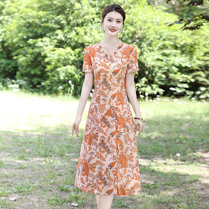 2025 新しいドレス半袖ドレスファッショナブルな新しいプリント花柄大きいサイズお腹カバー痩身ミドル丈スカート