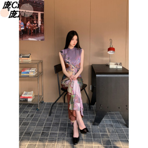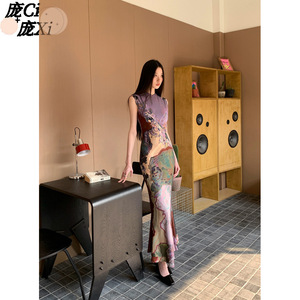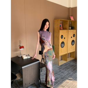 在庫あり、女性用の新しい中国風の前後着用可能なコントラストカラーのチャイナドレス、プリントフィッシュテールベストドレス、改良された国民風チャイナドレス