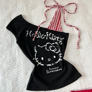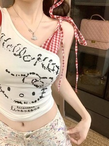胸パッド付き甘いホットガールストラップチェック柄ステッチ女性の夏の新しいデザインスリムオフショルダーショートトップ下着